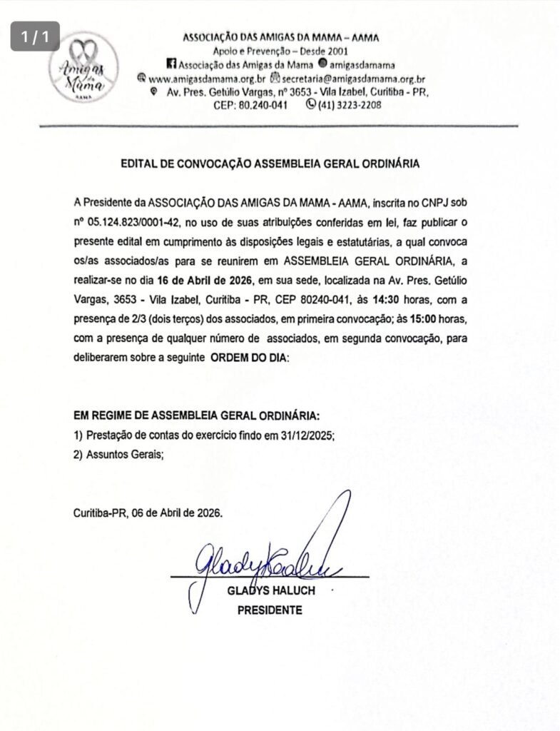A Associação das Amigas da Mama (AAMA) torna público o edital de convocação para a realização da sua Assembleia Geral Ordinária, reforçando seu compromisso com a transparência, a participação das associadas e a gestão responsável da instituição.